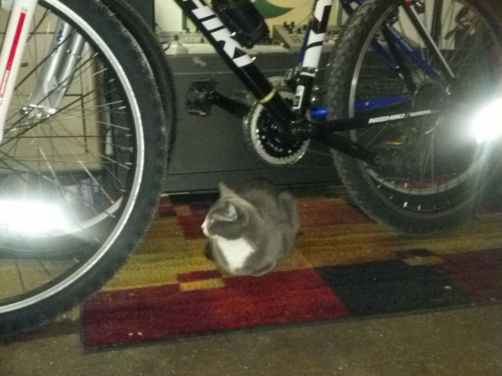 9pm – our bikes in the loft, with cat. Thom has biked down to meet us.