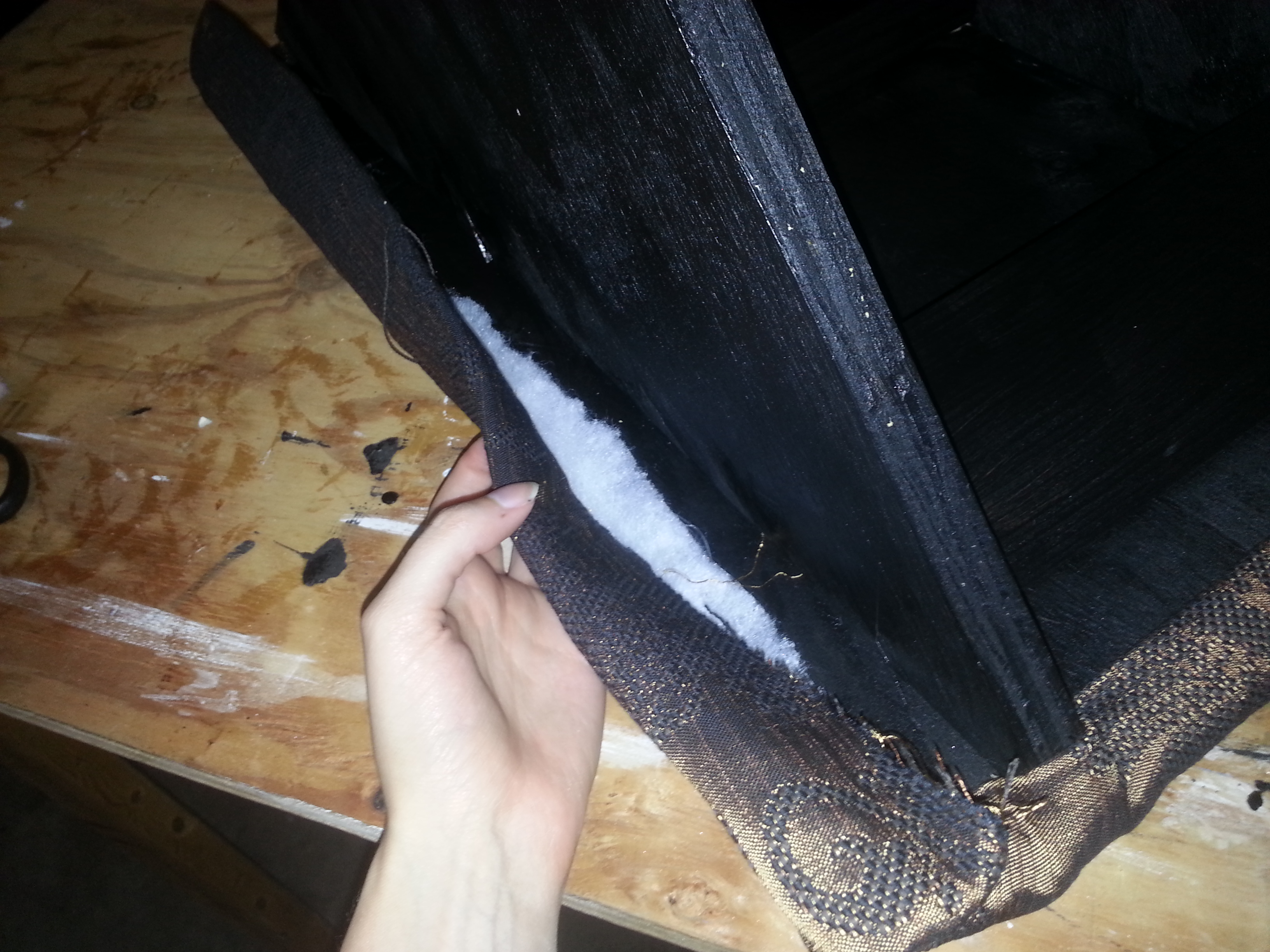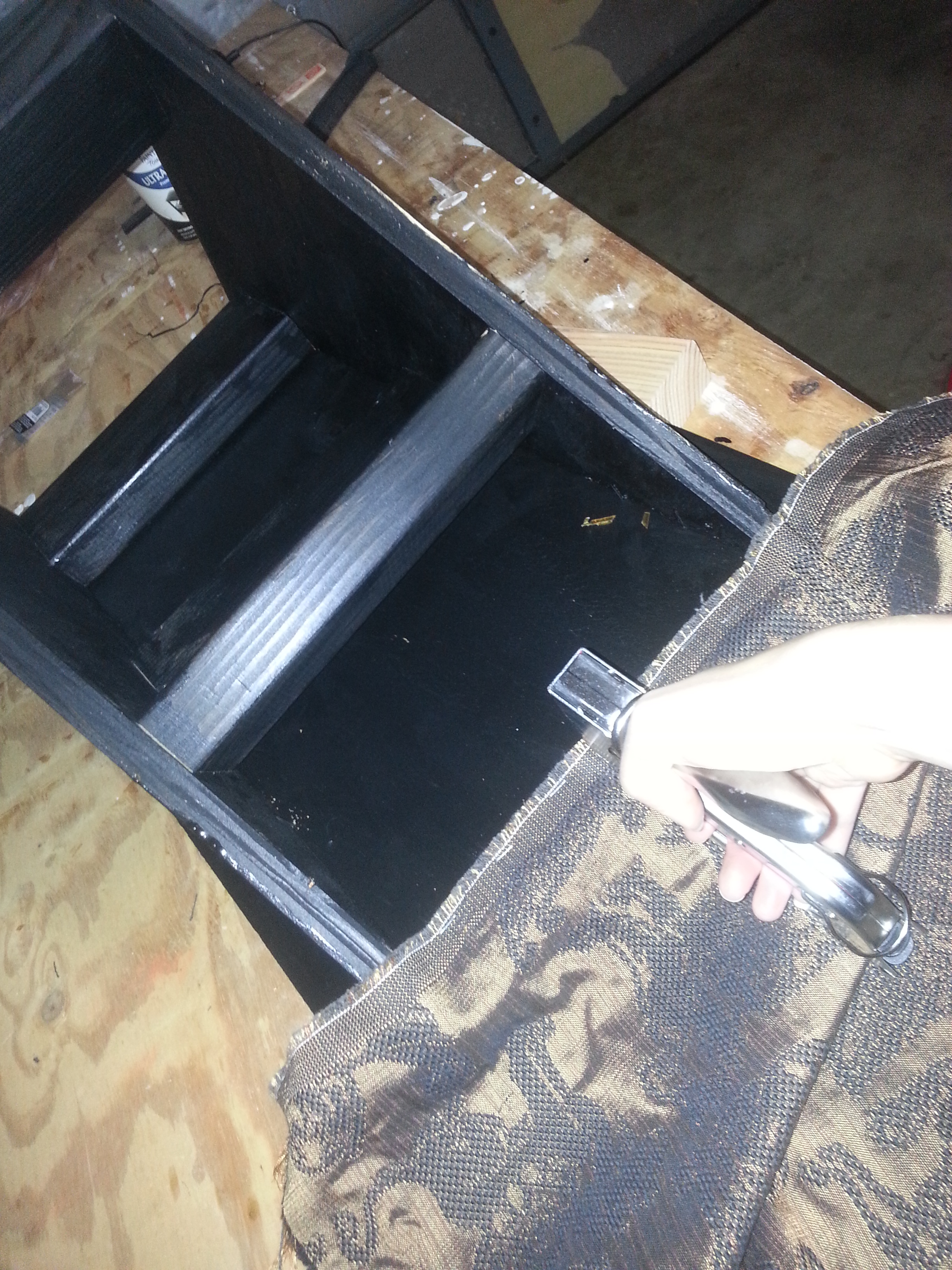 Step 6 – Attach the fabric on the sides. Fold the side edge, fold it again, and staple the shit out of it. The corners will probably need to be fudged to keep the fabric from poking out – I did this by pulling the folded over top edge waaayy over before making the initial fold on the side. At any rate, staple the shit out of it.