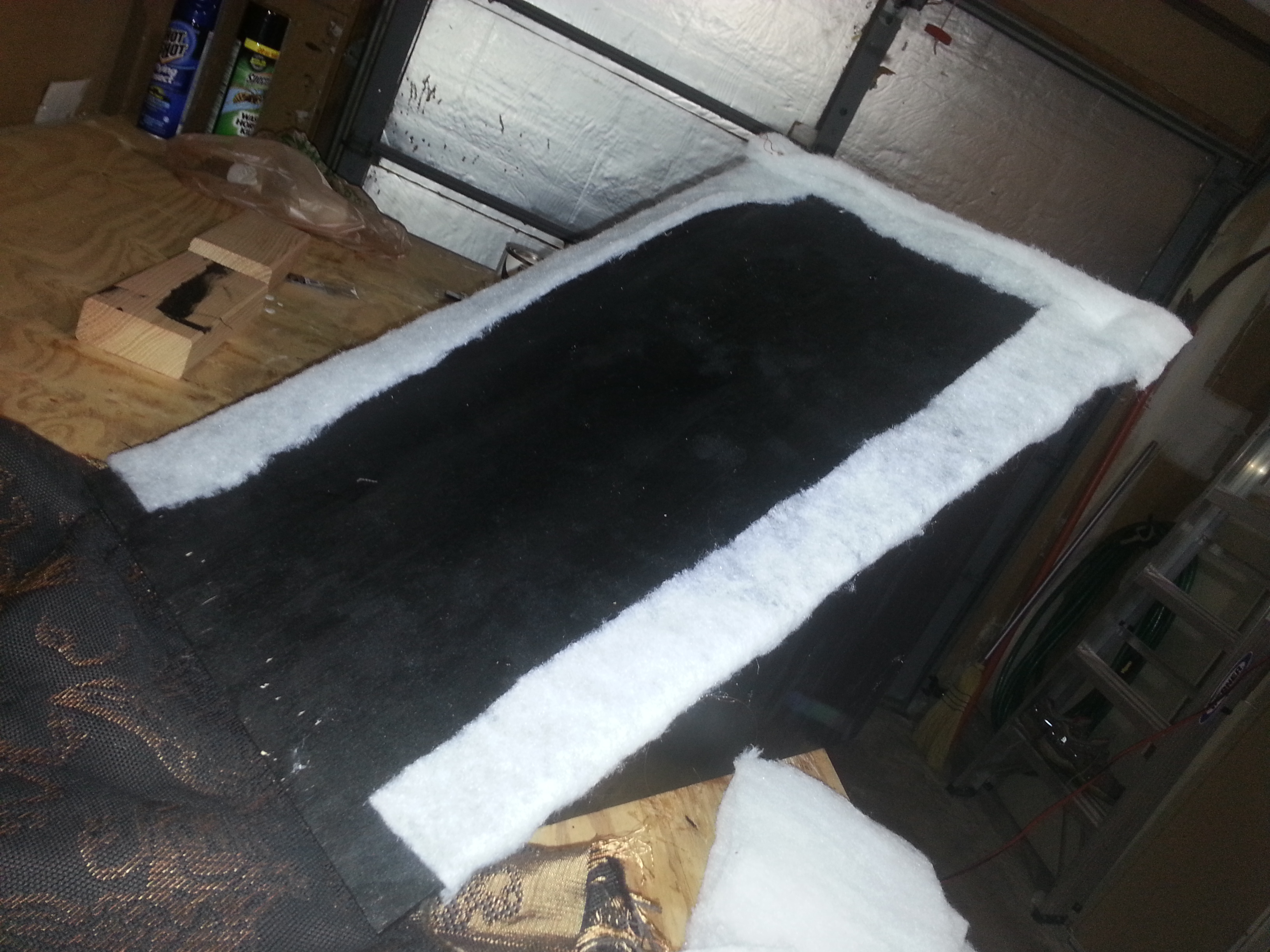 Step 3 – Apply fiberfill to the entire top surface of the ramp. Fiberfill generally is in a sheet-like formation when its put into the package; if you can take it out without destroying this formation, then you can use the sheet form its already in. Glue the fiberfill to the flat surface of the ramp. Then rip off any excess along the edges. I should probably throw in here that hot glue isn’t the only thing that’s going to hold the padding in place; its just holding it there during the process.