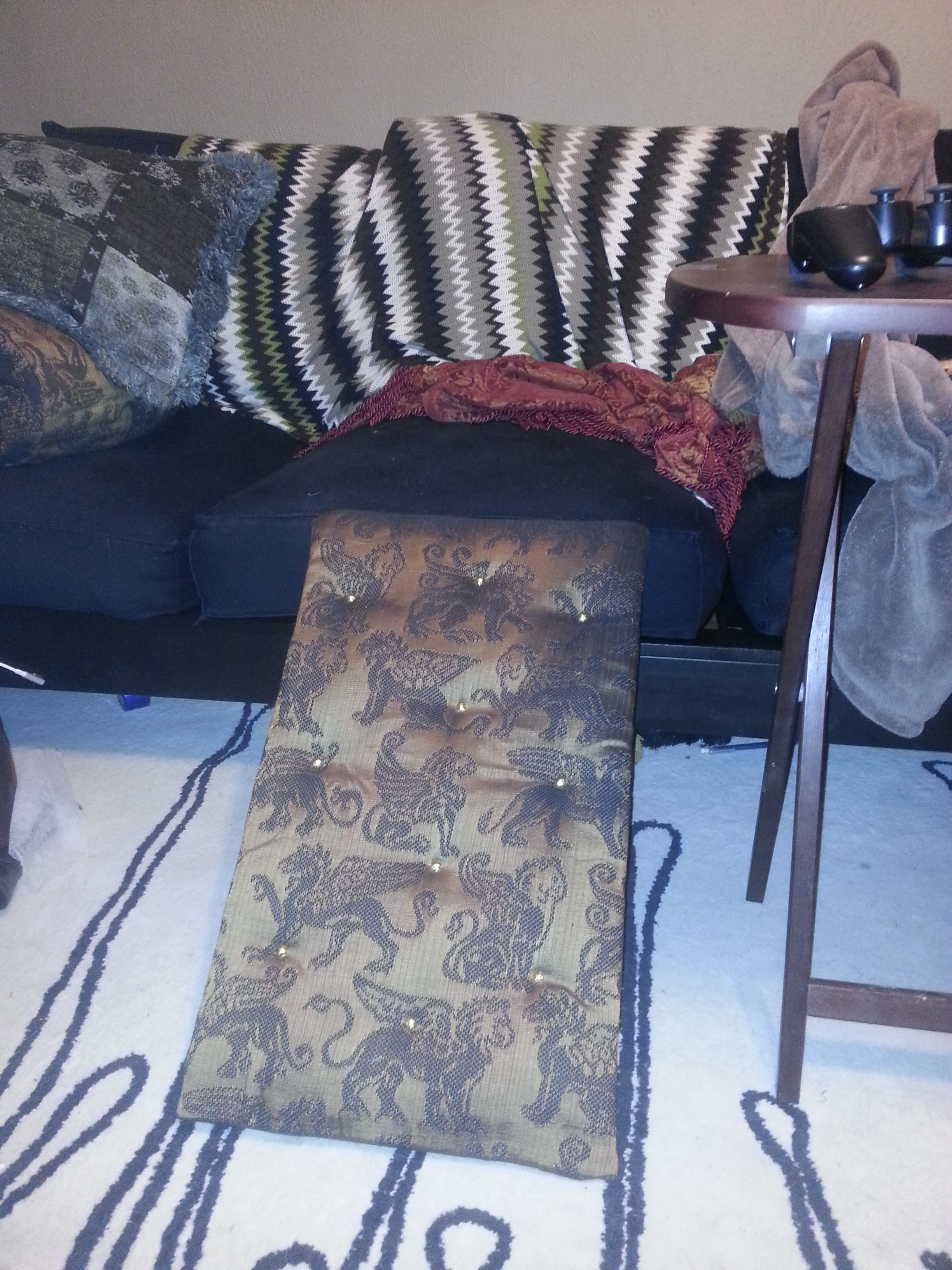 After trying several different pet supply stores and failing to find a suitable one (they sell pet stairs, but she’s not supposed to do stairs..) I resorted to building. I also decided to use upholstery for traction instead of sticking a piece of carpet on it, because carpet is ugly, and I have some cool fabric with gryphons on it.