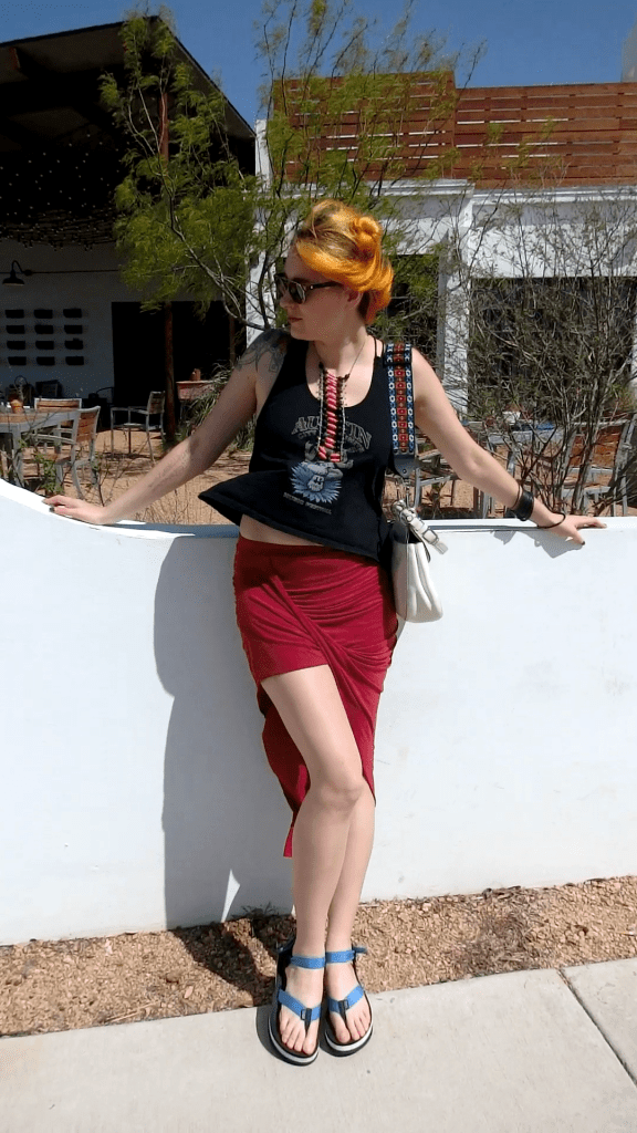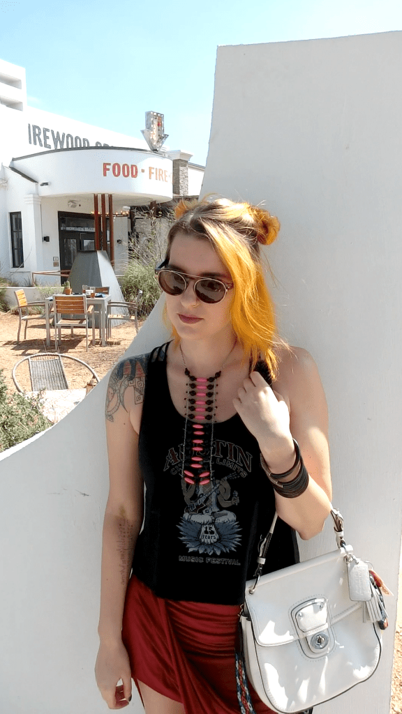 For this occasion I wore a crimson red asymmetric skirt from some shady Ebay seller and a tank top from last year’s ACL music festival. I stood upon the black and white foam platforms of Teva Women’s Flatform Platform Sandal as I surveyed my kingdom. My dirty, faded hair was wrapped into orange space buns. I carried a white Coach leather bag – my second one, as the first was lost to an armed robbery in a third floor office – hanging from an aftermarket vintage camera strap. Black bracelets from a Japanese H&M made my wrists look as if they had a purpose in life, and I finished the look with a necklace that you can’t buy. I conjured it into being from pink plastic tube beads, natural lava beads, and some wire. Instead of eye makeup, I applied some round Penguin brand men’s sunglasses – polarized, if you must know. I really wanted blueberry pancakes, but I decided to be sensible and have tacos.